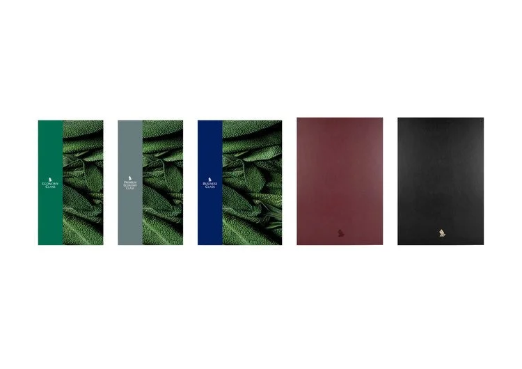 A showing of each menu from every class – from left to right, Economy Class, Premium Economy Class, Business Class, First Class and Suites.